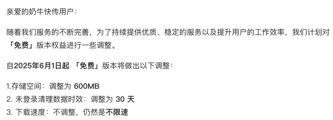 2024年2月,免费用户存储空间调整为 5GB,2025年6月,这个数字又调到了 600MB。