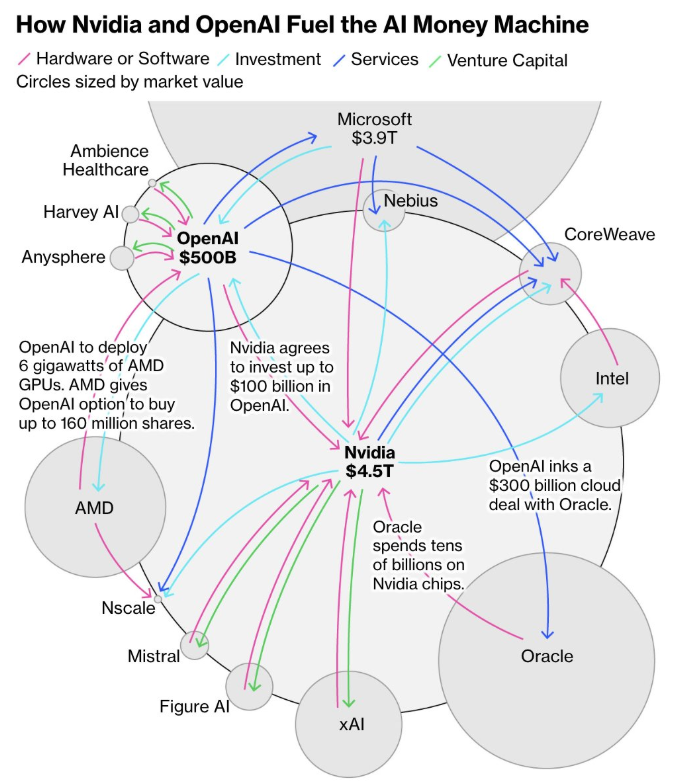 比如OpenAI向甲骨文购买3000亿美元的算力订单,而甲骨文与英伟达历来保持密切合作,势必增加算力芯片的采购,几乎同时,英伟达又宣布向OpenAI投资1000亿美元,共同建设超大规模AI数据中心。