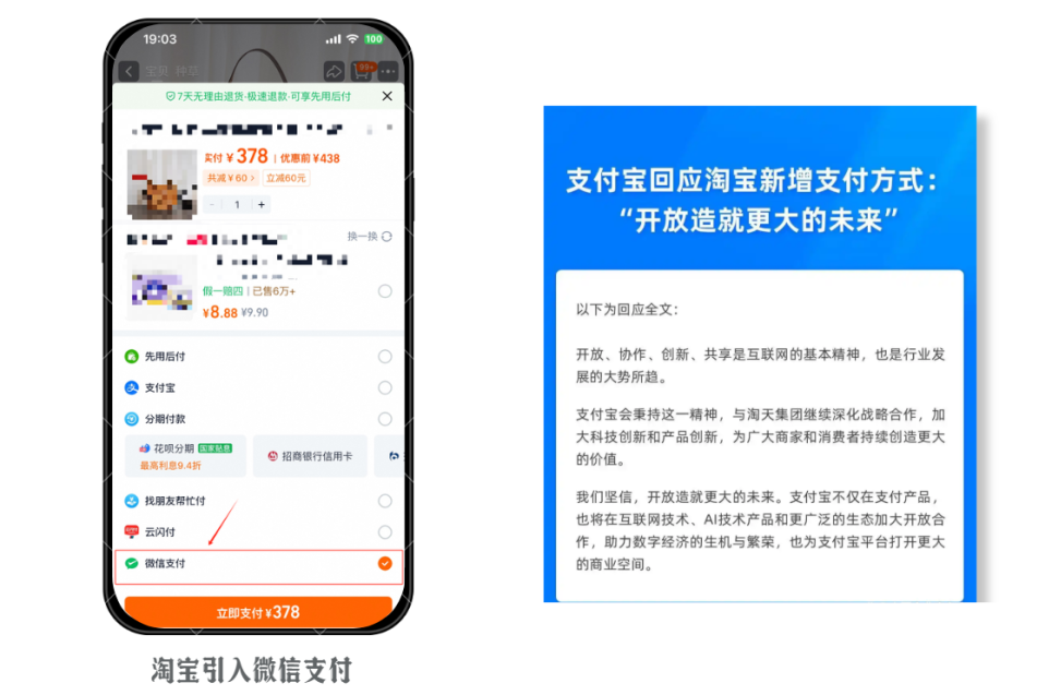 2024年9月,淘宝宣布新增微信支付能力,全面引入微信支付