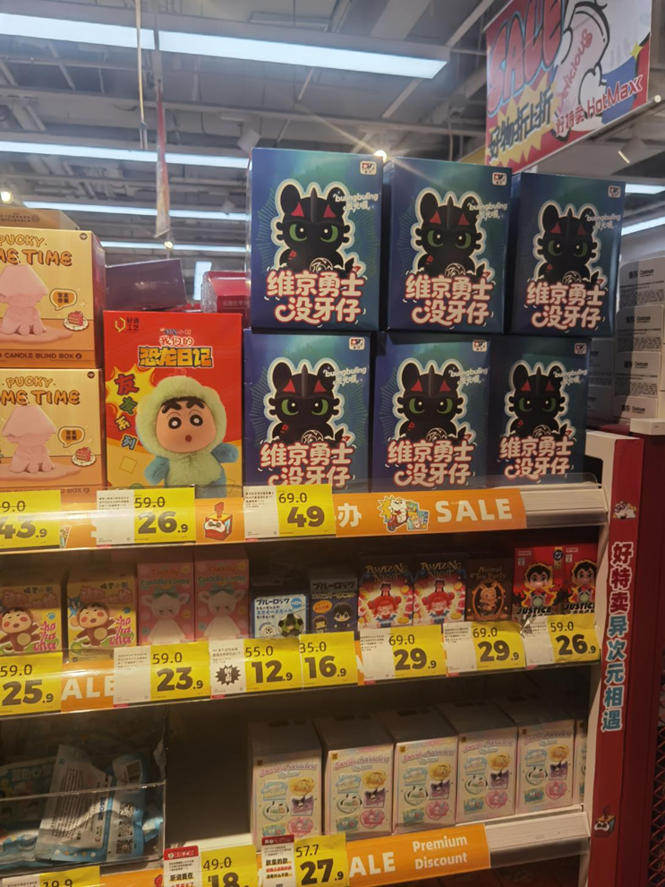 其实,好特卖也不是卖的都是完全不知名的IP。在北京丰台区银座和谐广场的好特卖店里,盲盒货柜共有六层,摆放着超35款盲盒IP,其中就包含了泡泡玛特PUCKY精灵、长城守卫军、星月驯龙高手、咒术回战等IP,优惠力度多在50%~70%之间。只能说这些IP,没有“全民破圈”,在黄牛党眼里,这些IP可能属于“失败系列”,因为升值空间不大。