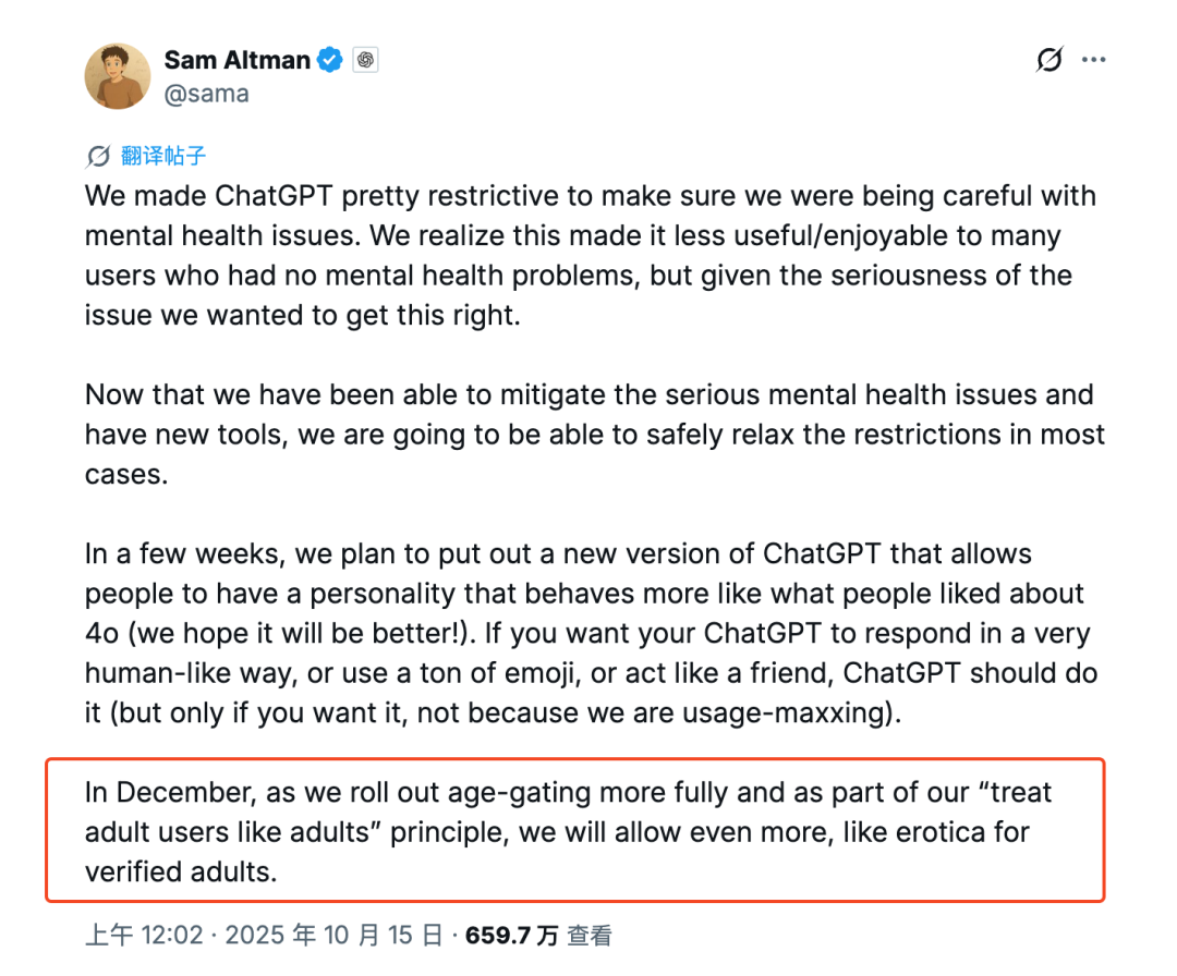 这些都不得而知。除了萨姆简短模糊的“like erotica for verified adults”表述外,OpenAI 未对此次更新做出任何回应。