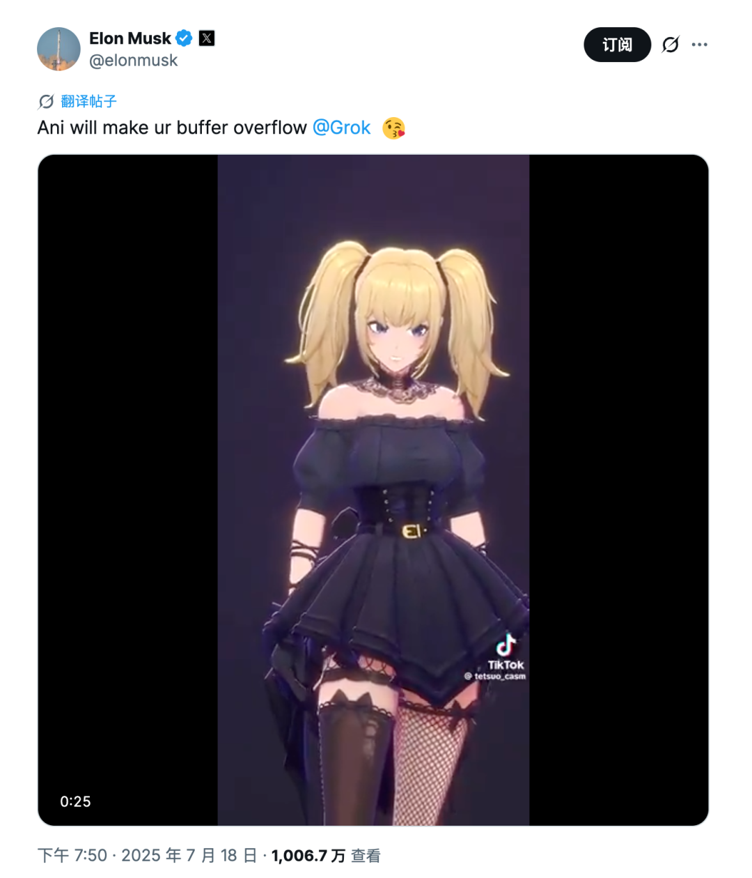 马斯克宣传 Grok 虚拟女友 Ani