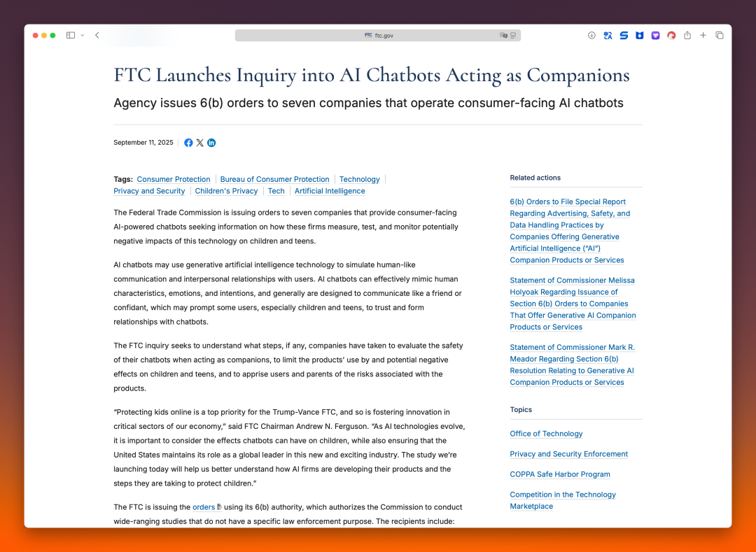 美联邦贸易委员会(FTC)9 月开始对 OpenAI、Alphabet、Meta 等 7 家科技公司展开调查,以评估 AI 聊天机器人对儿童和青少年的潜在负面影响。FTC 认为,AI 聊天机器人通常被设计得能够像朋友一样交流,可能会导致儿童及青少年与聊天机器人建立情感依赖。