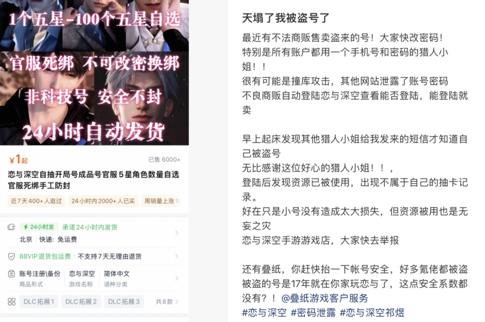 不少《恋与深空》玩家在社交平台发帖反映:自己的游戏账号被盗,并发现账号在某网店被售卖,平均售价从几元到上百元不等。不仅如此,更有玩家发现,自己使用同一手机号注册的叠纸旗下其他游戏,账号均被盗取。