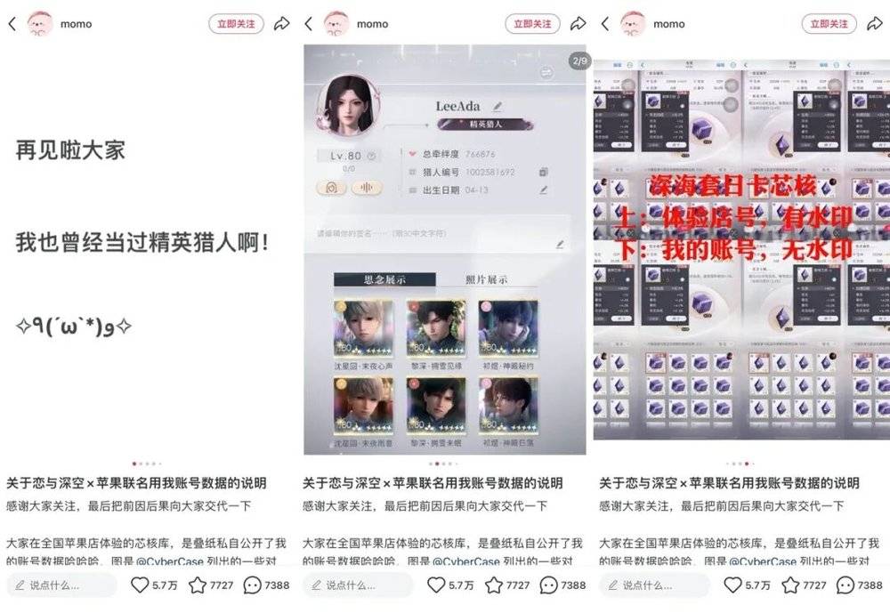 但一些事件又证明,叠纸有不尊重玩家的行为。2024年7月,一位匿名玩家在小红书发帖称,叠纸在未告知、未授权的情况下,私自将其个人游戏账号数据用于给全国苹果店做线下体验,发帖人认为这种“把玩家数据当工具”的行为,与女性向游戏“重视情感、尊重个体”的内核完全相悖。该名玩家晒出的等级为“精英猎人”,据其表述,其为《恋与深空》的深度玩家。