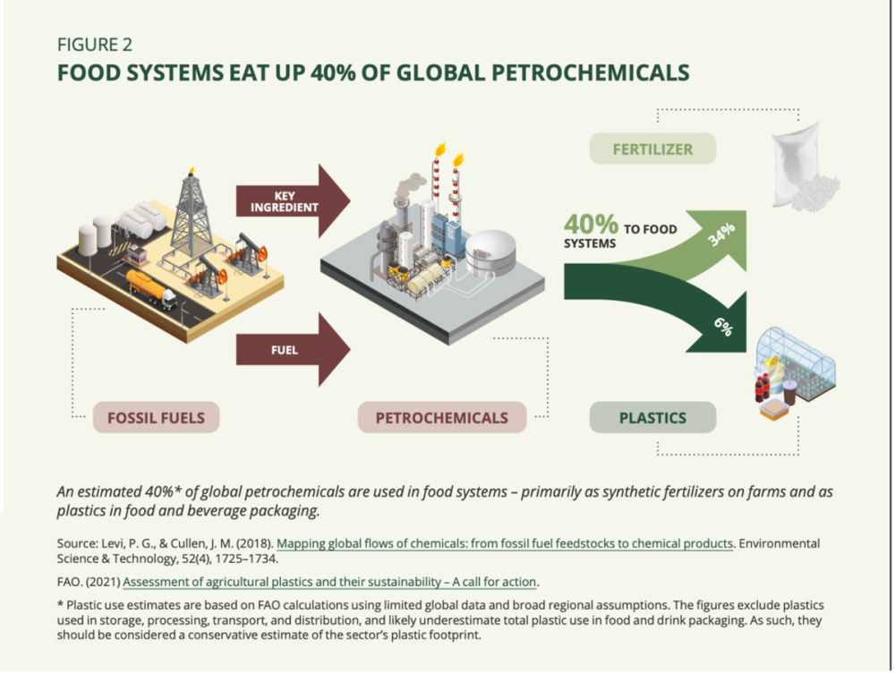 除了直接的能源消耗外,食物系统还“吃”掉全球40%的石化产品,其中34%用于生产化肥——报告指出,99%的合成氮肥和农药源自化石燃料,有6%用在了塑料生产中。