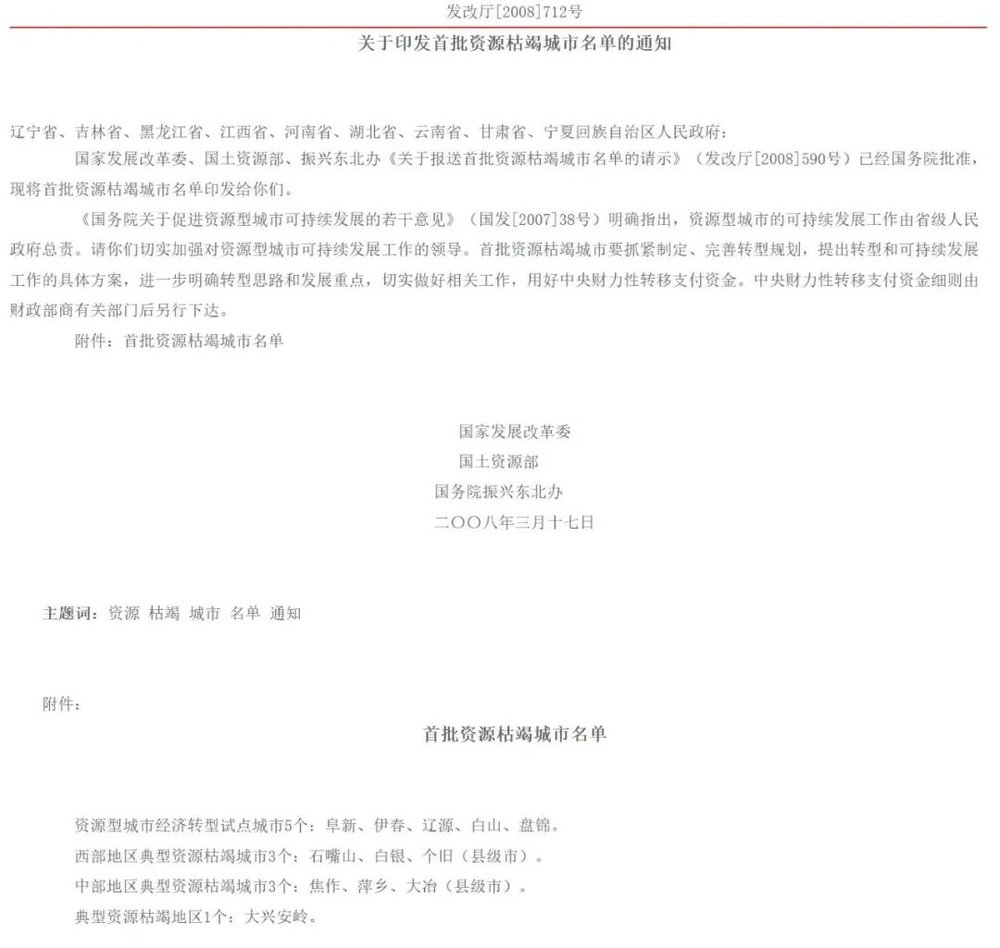 可能有人会有疑问,明明在2008年,中国公布了首批资源枯竭城市名单,阜新位列其中。那为什么说它是第一个,而不是第一批?
