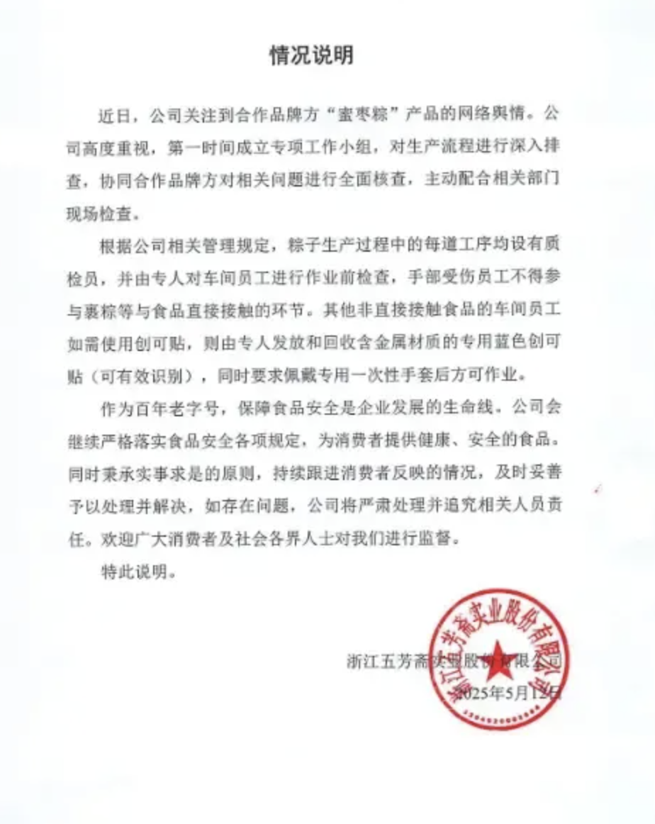 面对质疑,五芳斋在官网发布了一份情况说明,内容大致是“已第一时间成立专项小组,对涉事产品的生产流程进行全面排查,同时协同来伊份开展核查工作”。