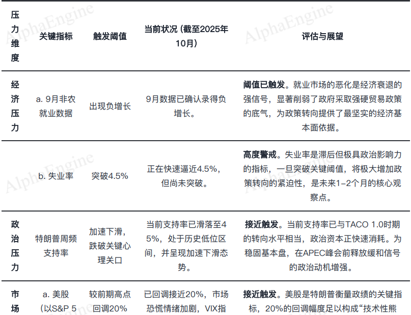 TACO 2.0的主要特征在于政策转向不再由单一因素触发,而是需要经济、政治、市场三大领域的压力同步达标,且调整节奏更为平缓,需要更长时间累积压力 。