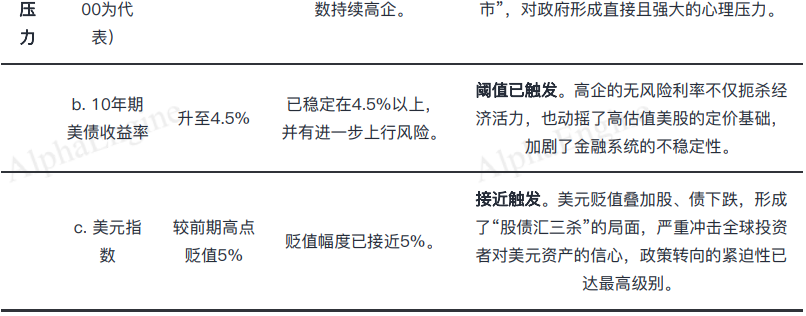 随着股市下跌、经济数据走弱(如通胀、就业恶化)以及政治支持率下滑,特朗普政府面临的内外政治经济压力逐步累积,触及其执政KPI的容忍阈值。