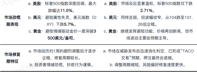 TACO 1.0 属于单一博弈。这个模式主要围绕单一的关税威胁展开,市场反应剧烈且迅速,通常在政策威胁后出现急跌,并在数日或一两周内快速修复,呈现出高波动、短周期的特征,典型代表是2025年4月的“解放日关税”事件。