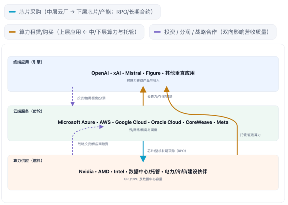 中间是齿轮:云厂(Oracle、微软、亚马逊、谷歌、Meta)搭机房、卖算力。