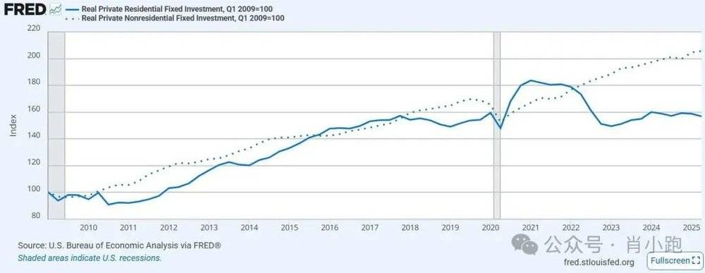 有证据吗?美国今年第一季度,数据中心投资对GDP 贡献约为1%,掐指一算,这可是接近当年 GDP 增量的一半。非住宅(数据中心等)强劲扩张,而利率敏感、同样需要资源的其他建设被压制。