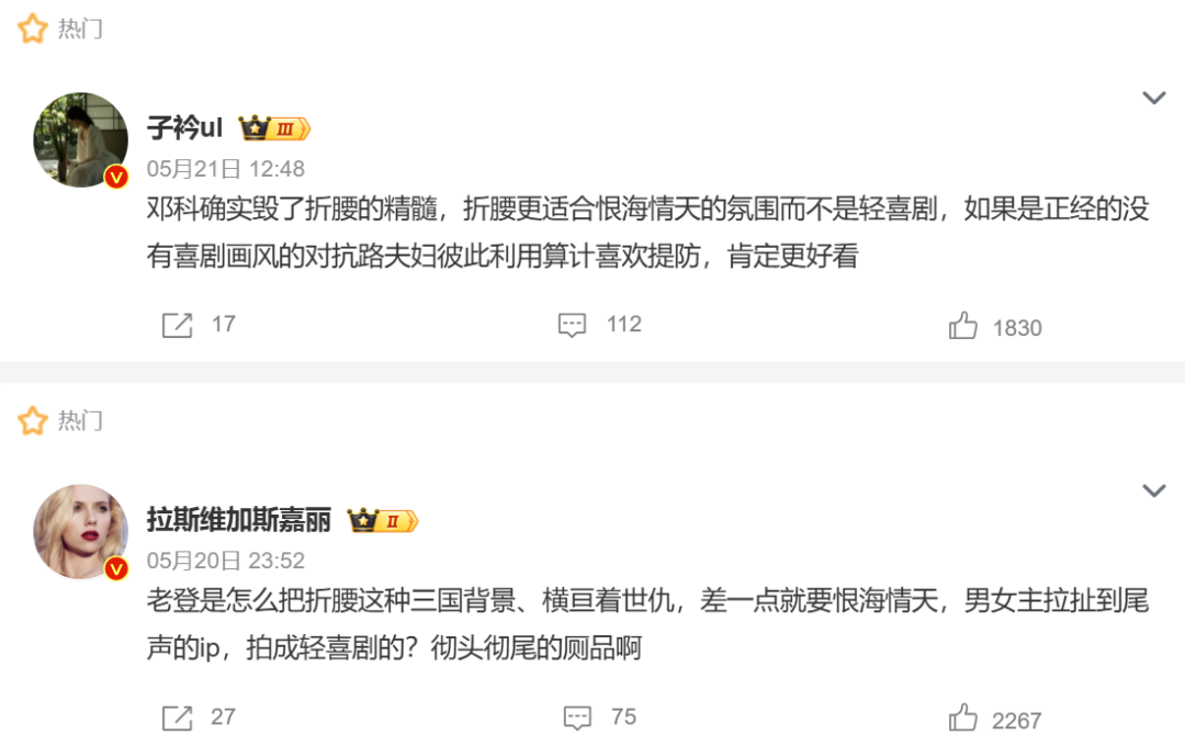 为了不“虐女”,除了复仇类型惨遭阉割,“恨海情天”也备受荼毒。《折腰》已经算是品相成绩都令人惊喜了,但邓科招牌式的轻喜剧将剧版的画风推向了“娇妻训狗”,而非原本的女主如履薄冰、男主冷脸做恨,从小说影视化的角度仍存在遗憾。收视高开而未能暴走,恐怕也有几分体验不够深度的原因。