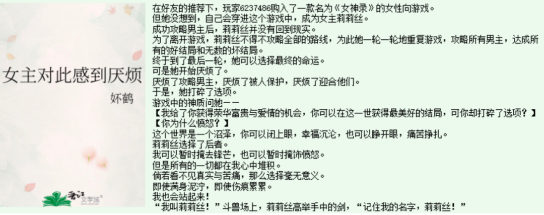 目前公认的“爱女文学”两大名著均出自老牌网文平台:晋江的《女主对此感到厌烦》(作者妚鹤)与起点女生网的《为什么它永无止境》(作者柯遥42)