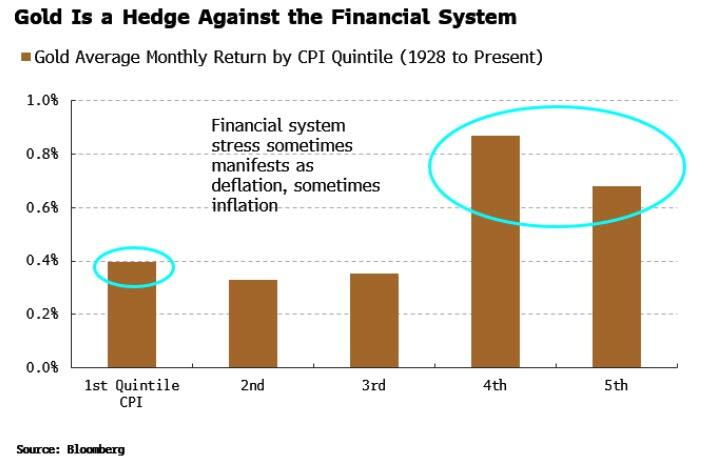 如果发生通胀冲击,黄金将扮演其广为人知的角色,作为对冲货币贬值的工具。但如果发生的是信贷危机和通缩,市场对高质量抵押品的需求将变得更为迫切。