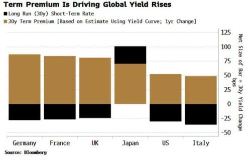 (期限溢价的上升推动去年大多数主要发达市场国债收益率的上升)