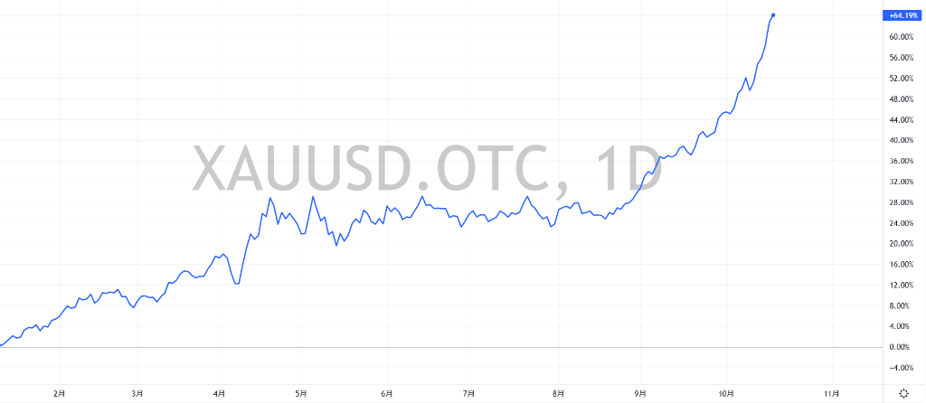 10月16日,黄金涨势不减,连续第四个交易日创历史新高,首次突破4300美元大关。黄金今年初以来已累涨超60%。