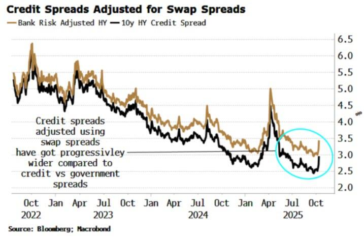 然而,情况正在变化。据报道,随着全球贸易紧张局势再起,以及一家负债百亿美金的公司First Brands宣告破产且据称有超过20亿美元资金“不翼而飞”,信贷利差近期重新走阔。