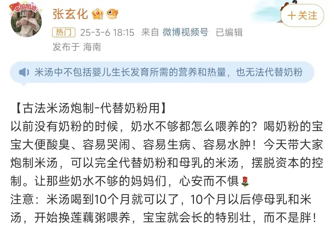 他曾在公开主张“用古法米汤替代奶粉”喂养婴幼儿,摆脱资本控制,孩子不喝奶粉只喝米油,可以长得白又壮。结果后续被扒出来,他的视频背景里摆放着一罐明晃晃的名牌奶粉。