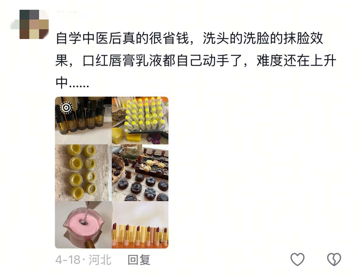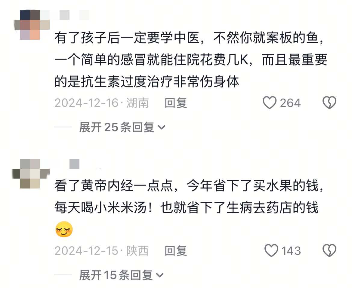 宝妈2号自述,别人研究DHA的时候,我背黄帝内经;别人喝冰美式的时候,我保温杯里泡黄芪;别人小孩因为流感生病,我家娃会找足三里穴位;别人家里进口药塞满药箱,我家里刮痧板配艾条。