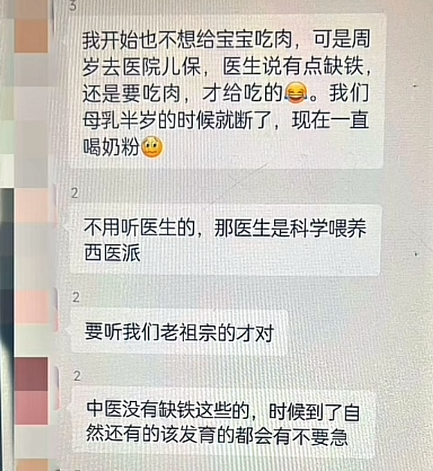 孩子被医院检查出营养不良缺铁,但宝妈依旧坚持不给孩子吃肉,群友们纷纷助力:西医亡我之心不死,千万别相信西医的科学喂养,中医根本不存在缺铁的概念。