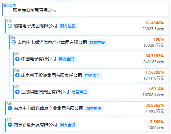 公开资料显示,熊猫家电系央企中国电子信息产业集团下属二级子公司南京中电熊猫信息产业集团(下称“熊猫集团”)旗下负责电视代工业务的三级子公司(2024年6月21日更名为南京静业家电有限公司,下称“静业公司”)。