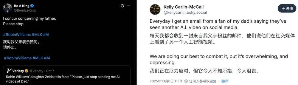 马丁·路德·金的女儿Bernice King,转发了Zelda关于这些AI视频的看法,并直言:“请停止”。类似的声音还来自喜剧演员George Carlin的女儿,她甚至表示家人正在尽最大努力,对抗深度伪造。