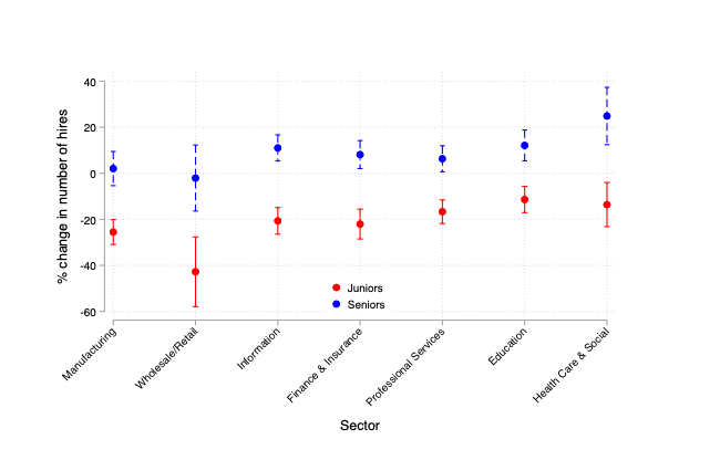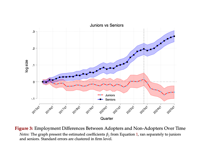 这些研究发现表明,生成式AI正在引导一种“资历偏向型变化”,在企业内部对初级职位产生不成比例的影响。