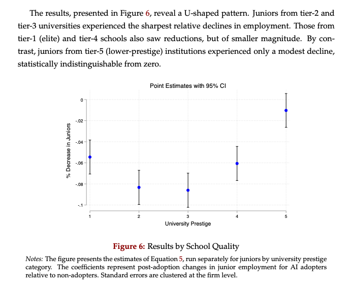 有趣的是,AI冲击最大的人群,竟然不是末流大学生,而是中档名校毕业生。