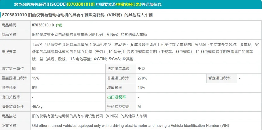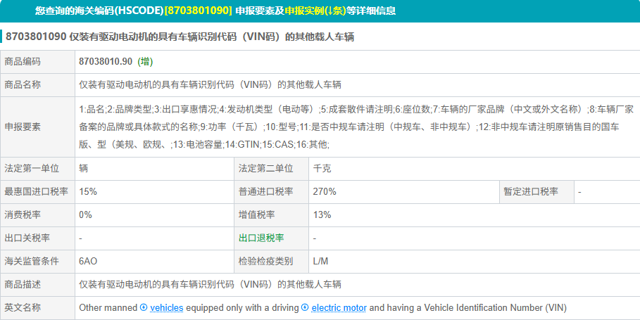脖子哥翻阅了具体的海关编码,这次新增了具有识别代码的纯电车(编码:87038010.90)这一类目,与原来二手纯电车(编码:87038010.10)并不一样。