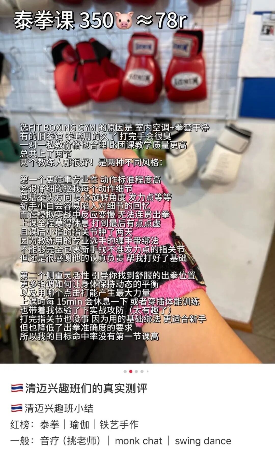 而且,价格优势明显,“花个美甲钱,就能跟着本地泰厨奶奶从菜市场学到餐桌;用北京半节私教课的费用,直接解锁带国际认证的泰拳课。而一些本地主流课程,比如泰拳、泰餐、瑜伽之类的,教学质量甚至都比国内更好。”