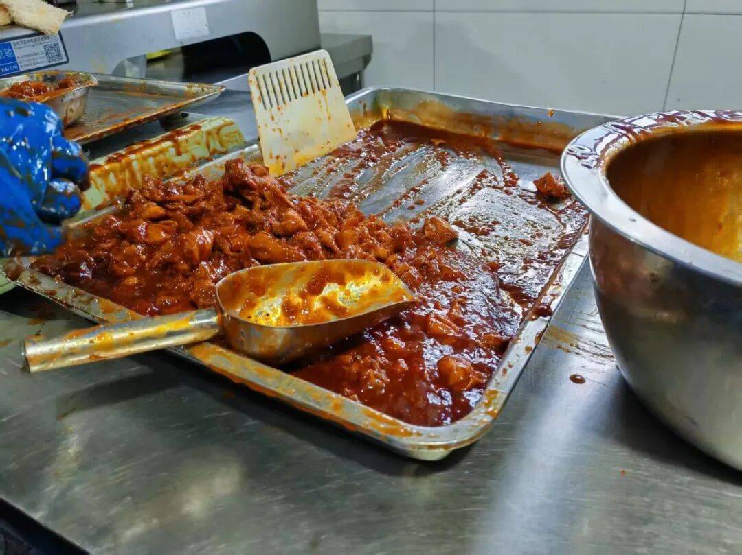 在生产区,几名厨师正在大铁锅前搅拌卤汤,锅里是大块牛肉和牛骨。分装区域,有员工手动将炒好的鸡肉称重装盘,鸡肉看起来有些过于粘稠。