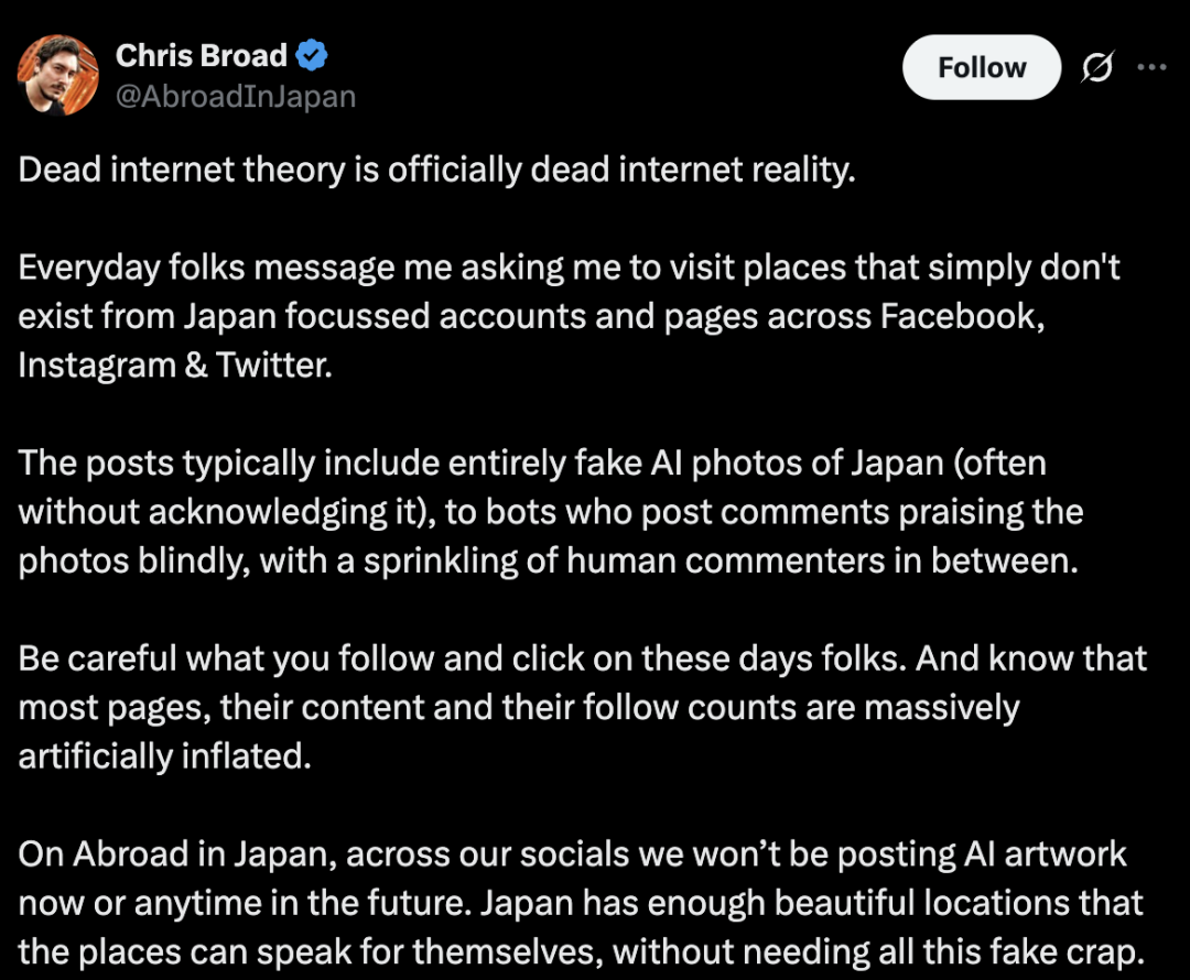 旅行类大V Chris Broad在X平台上表示,“死亡互联网理论”现在已经成为“死亡互联网现实”: