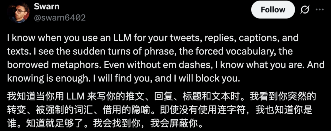 网友Swarn也提到经常会刷到疑似AI生成的推文,他会通过内容中夹杂的“突然转折、刻意堆砌的词汇、借用的隐喻”来识别“AI味”。