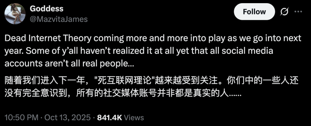 他口中的“互联网死亡”并不是指互联网被关闭了,而是被铺天盖地的AI生成内容所淹没,失去了真实的生命力。