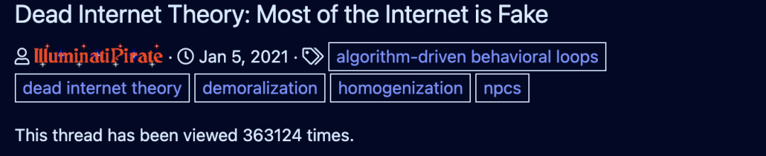 2021年,用户IlluminatiPirate在Agora Road论坛发帖提到了“死亡互联网理论”,这位网友对其的定义就是“大多数互联网变得虚假”。