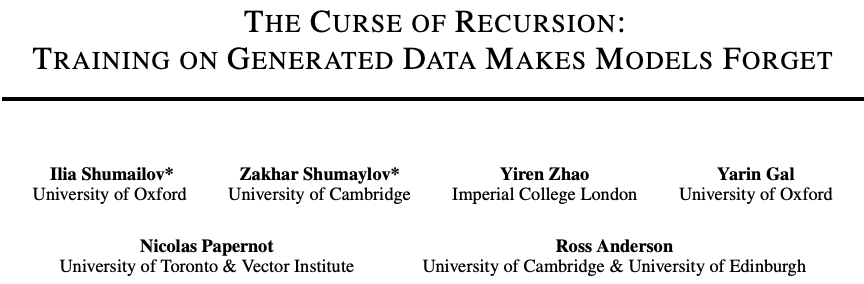 这一点在牛津大学等研究机构发表的《递归的诅咒(Curse of Recursion):在AI生成数据上再训练会导致模型遗忘》论文中已经得到了理论上的证实。