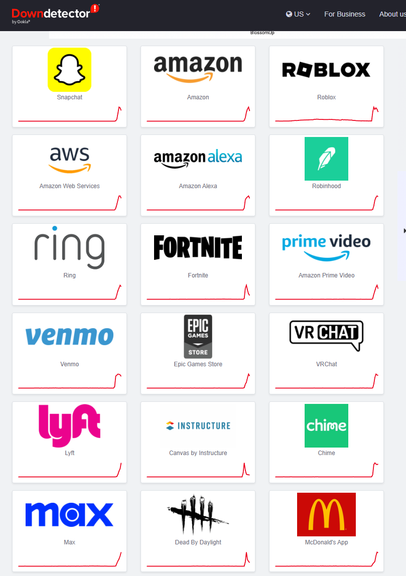互联网服务监测网站Downdetector显示,成百上千家美国网站和应用都受到这次事件的冲击,已确认出现故障的主要平台和服务包括: