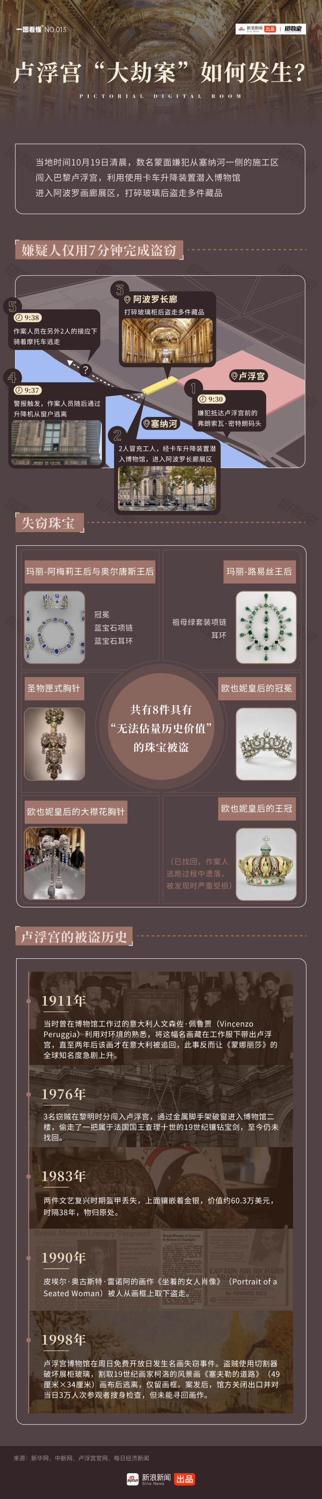 当地时间10月19日清晨,巴黎卢浮宫在开馆后不久便遭遇了一场精心策划的持械抢劫。数名蒙面劫匪伪装成工人,利用塞纳河畔施工区的漏洞,通过卡车升降装置潜入赫赫有名的阿波罗画廊。在短短七分钟内,他们盗走包括冠冕、项链、胸针在内的多件无价珠宝,随后迅速沿原路逃离,整个过程宛如一部精心编排的好莱坞犯罪片。