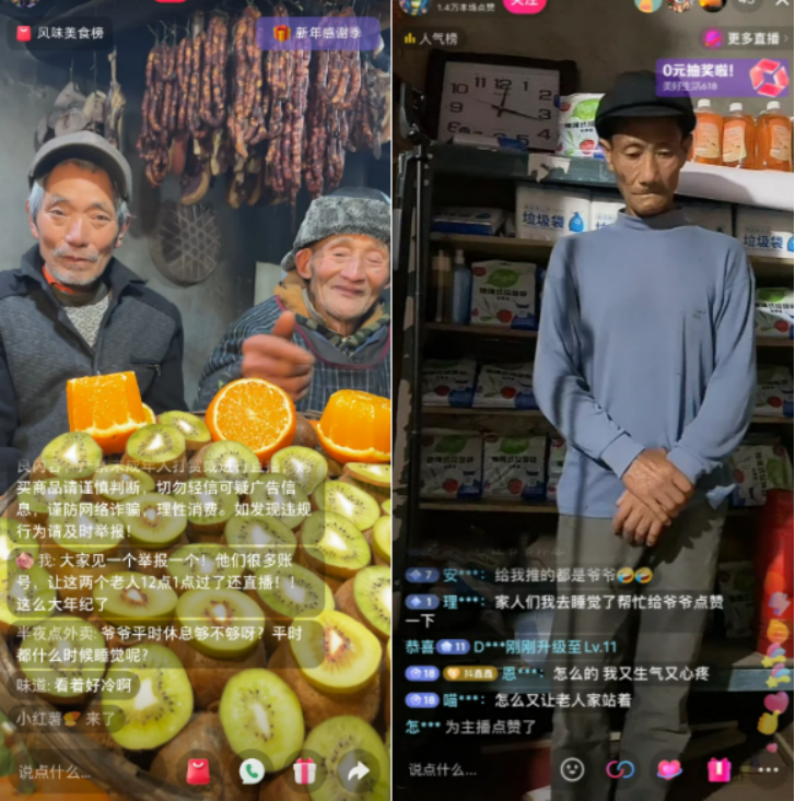 深夜,当主流主播们结束一天的喧嚣,另一类直播间却在寂静中迎来高光时刻。镜头前,白发苍苍的老人面容憔悴,诉说着子女不孝、产品滞销、疾病缠身的悲苦故事,声泪俱下;镜头后,订单伴随着“支持爷爷”“买一单帮帮他”的评论汹涌而至,虚拟礼物铺满屏幕。