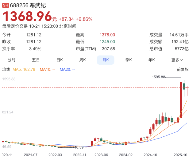这样的业务表现,加上市场对于寒武纪未来发展的高预期,寒武纪的股价在 2025 年的持续上涨中超越茅台,并在 2025 年 8 月 28 日达到 1595.88元 的历史最高点位。