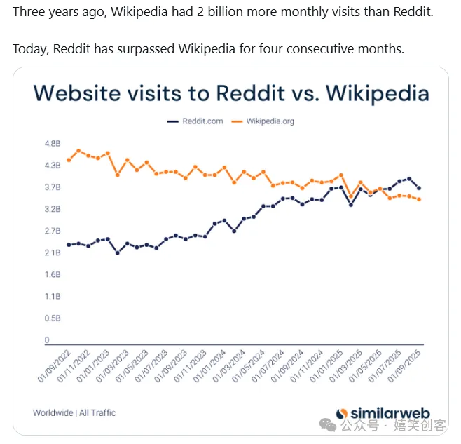 挺有意思的图,看来wikipedia等百科全书最容易被GPT等LLM AI替代,Reddit这种论坛社区依然顽强生长,甚至因为能为大模型源源不断提供真实语料而价值凸显。