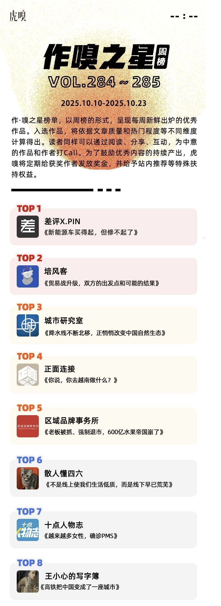 作·嗅之星榜单,以周榜的形式,呈现每周新鲜出炉的优秀作品。2025年10月10日~2025年10月23日,虎嗅第284~285期,作·嗅之星的获奖文章分别是: