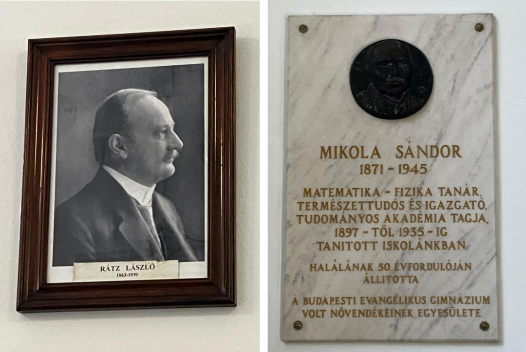 图8(左)学校走廊上数学老师RátzLászló的照片,他在数学教育改革和推广方面做出了杰出的贡献。(右)学校走廊上物理老师Mikola Sándor的纪念牌,其人本身也是优秀的物理学家。|图源:笔者拍摄