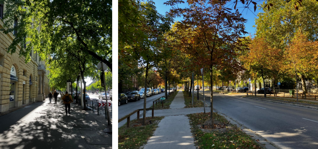 图5(上、下左)阳光下的建筑与斑驳的树影,让人想起BelleÉpoque的美好年代,让人想起浪漫主义音乐和印象派的画作。(下右)布达佩斯-法索尔福音高中外的林荫道,一百年前,维格纳、冯·诺依曼等一众布达佩斯火星人都从这里走过,并改变了世界。|图源:笔者拍摄