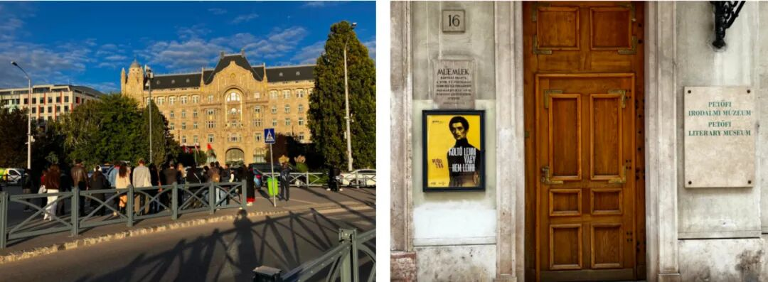 图4(上)从布达一侧回望佩斯,塞切尼链桥和桥头的狮子,桥的远侧就是格雷沙姆宫(Gresham Palace)和多瑙河畔的匈牙利科学院,更远处,圣斯特芬主教堂的穹顶与天际线相连。(下左)阳光下格雷沙姆宫,中欧地区新艺术主义建筑的代表作。(下右)裴多菲文学纪念馆(裴多菲就是我们耳熟能详的“生命诚可贵,爱情价更高,若为自由故,二者皆可抛”的作者,他也是匈牙利人)。|图源:笔者拍摄