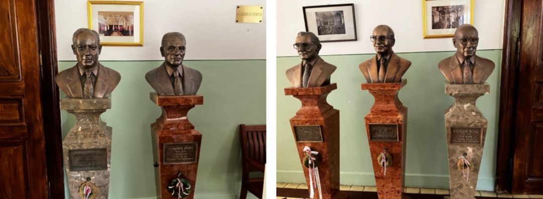 图7(上)学校外墙上的纪念牌,记录维格纳,冯·诺依曼和海萨尼都在这里求学。下面的小字中提及对他们影响很大的几位布达佩斯-法索尔福音高中教师,其中两位老师Mikola Sándor和RátzLászló在本文中都会提及。下面的浮雕显示,目前的校舍启用于1905年。(下)学校走廊里杰出校友的半身像,下左为冯·诺依曼和海萨尼,下右图最右边为维格纳。|图源:笔者拍摄