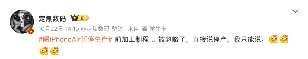 结果被媒体传成了“iPhone Air停产”,把@定焦数码 本人都给整懵了。