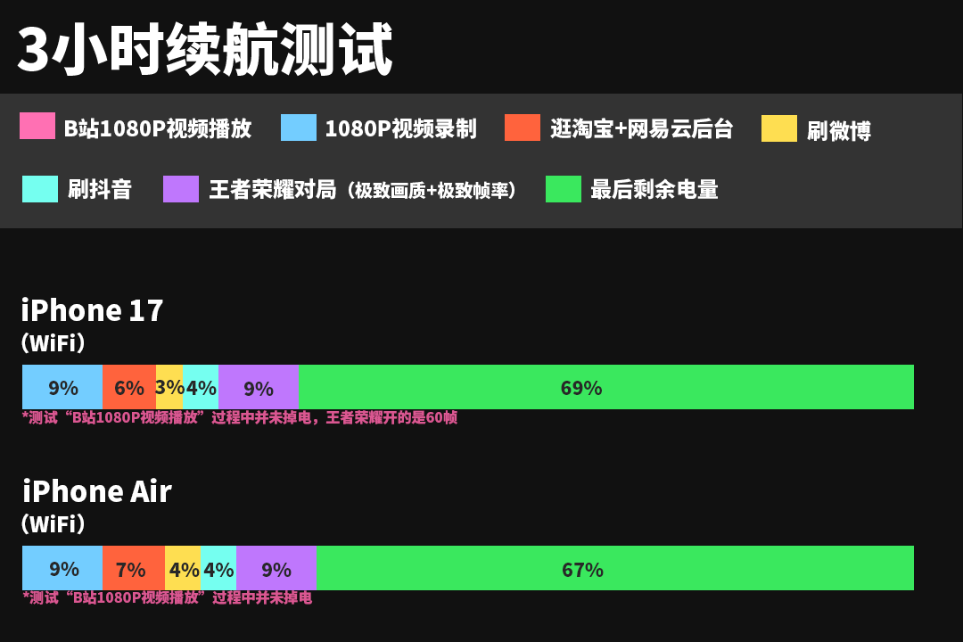 在3小时续航测试中,它的剩余电量只有67%,这个成绩是要落后于iPhone 17标准版的。